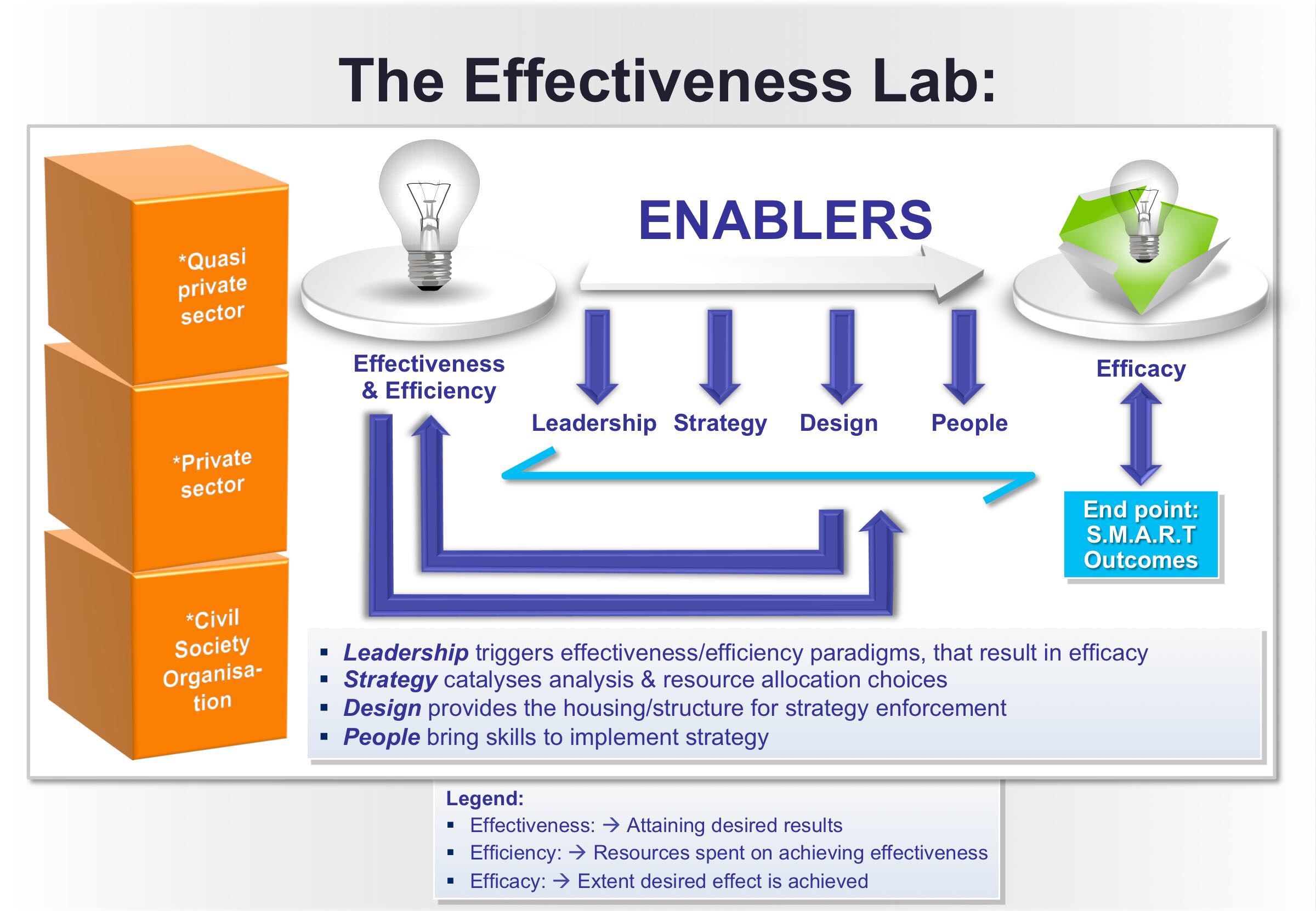 The Effectiveness Lab examines how organisations and individuals achieve meaningful outcomes through systemic approaches to performance. We believe effectiveness is not an isolated concept but a comprehensive system that, when combined with efficiency, produces both efficacy and SMART results.